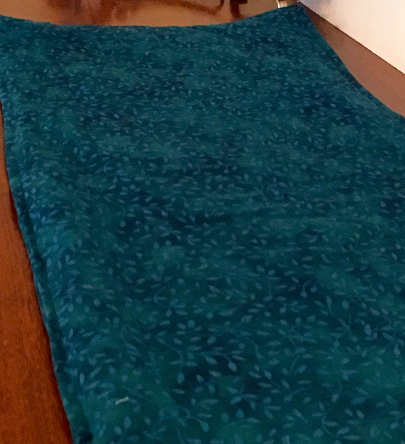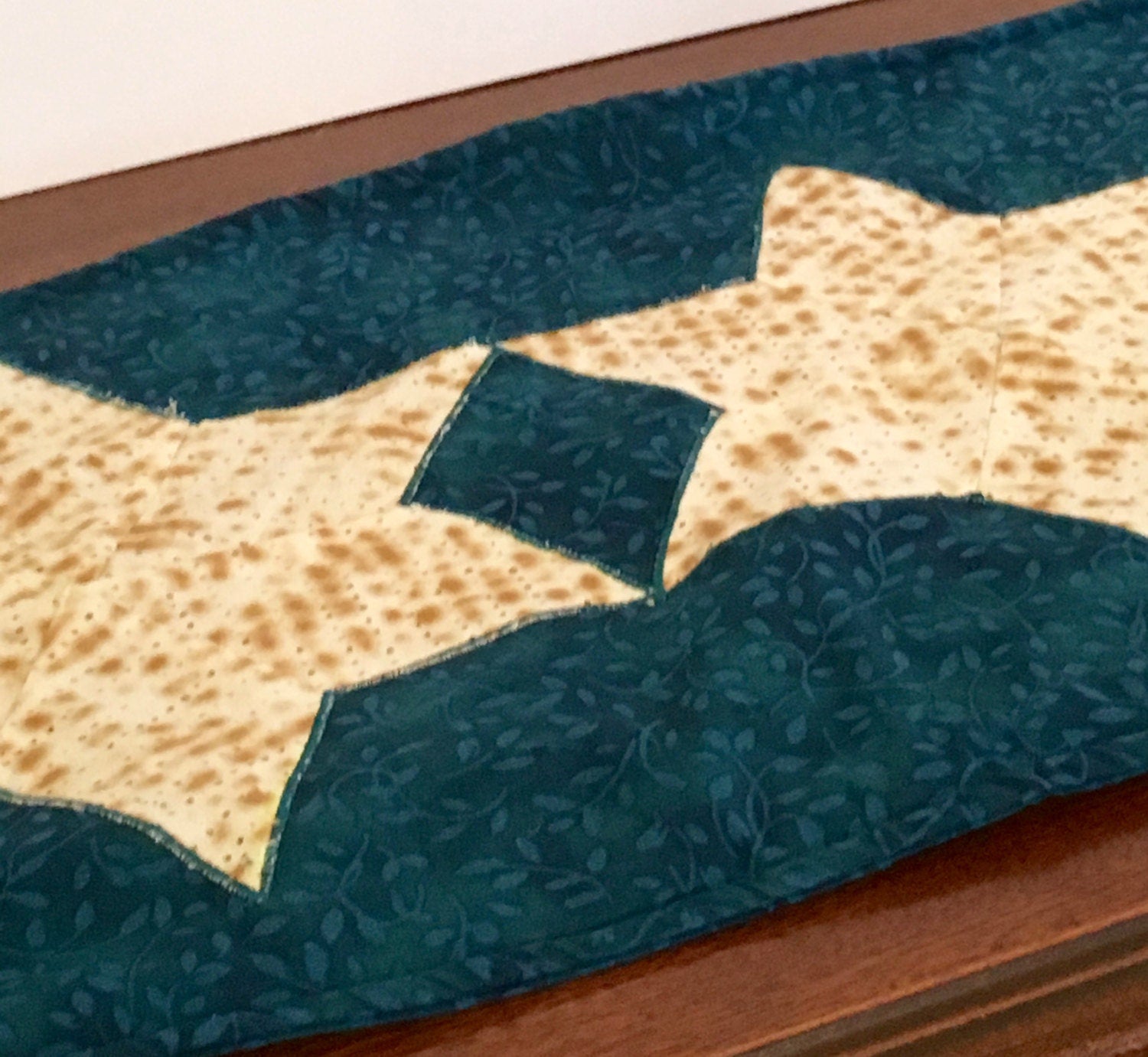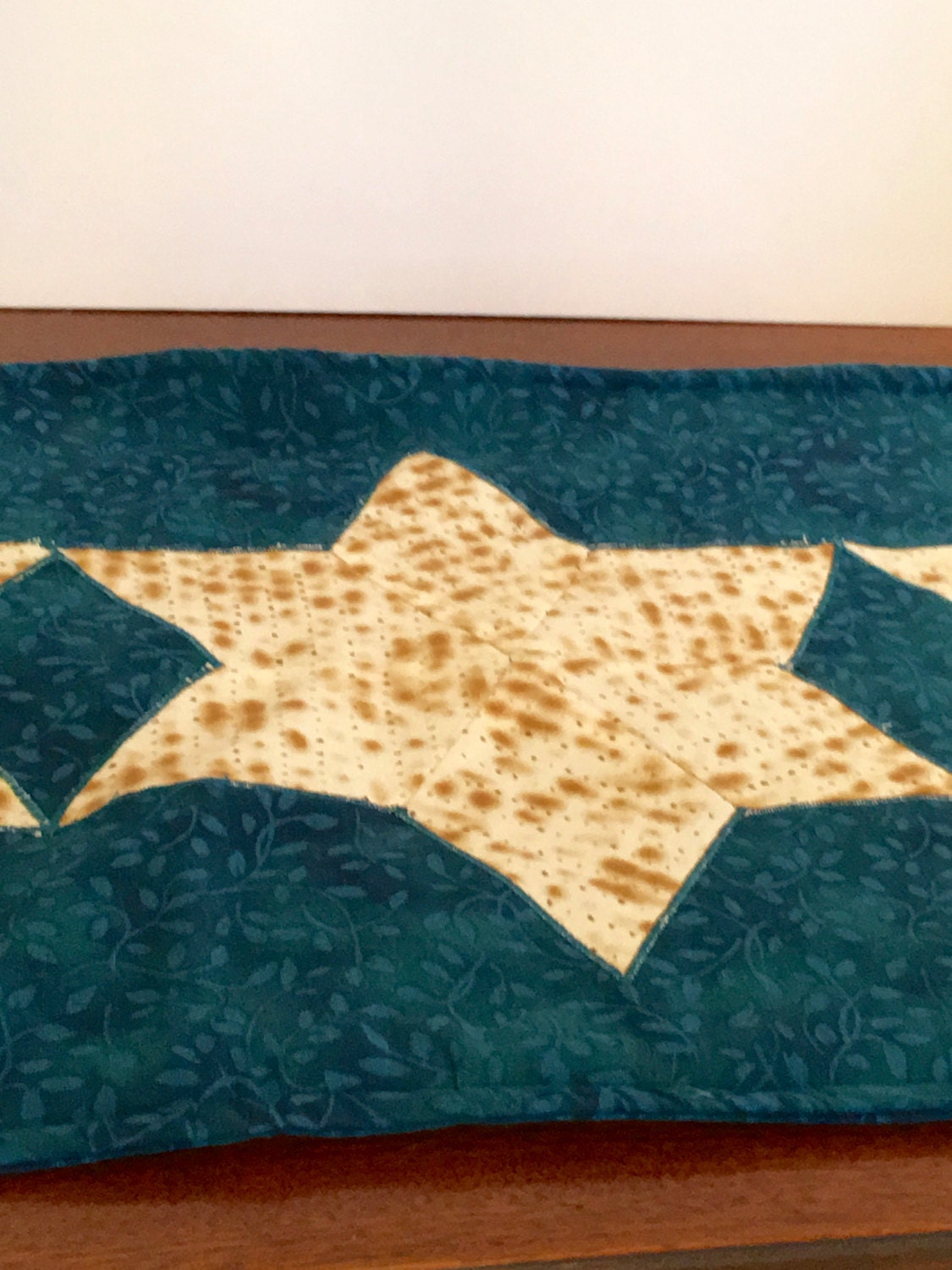 One side is leaf print/batik teal with the 3 appliquéd Jewish Stars of Matzah fabric.